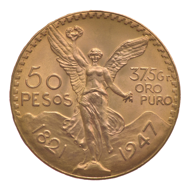Minted between 1921 and 1972 (restrikes after 1949), this is one of the largest bullion coins minted for currency containing 37.5g of pure gold. It features winged victory and the mexican coat of arms on the reverse.